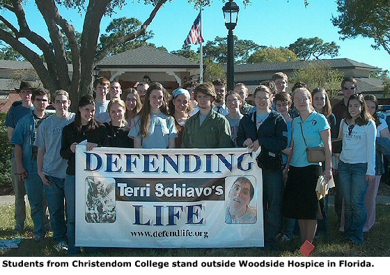 Back to the April 2005 Newsletter Index Christendom Collegiates, Defend Life Join Schiavo RallyBy John Jalsevac (Excerpted from a March 14 article on LifeSiteNews.com.) On a chilly Friday, March 11, at 9:30 p.m. I, along with 20 of my schoolmates from Christendom College in Front Royal, Va., boarded a chartered bus to join 20 members of the Baltimore-based organization, Defend Life. Our destination was Woodside Hospice, where Terri Schiavo is currently awaiting her court-ordered execution by starvation and dehydration, scheduled to begin March 18. A rally in support of Terri was scheduled for the day following our departure, and it was our goal to arrive in time to add our small numbers to that rally.