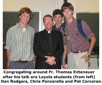 Back to the October 2004 Newsletter Index Defend Life Lecture SeriesFr. Euteneuer Rallies Pro-Lifers At Loyola HighLoyola Dons packed Room 114 in Burk Hall September 16 to hear the president of Human Life International deliver a no-holds-barred analysis and indictment of the Culture of Death, and challenge them to take up the fight against it. Fr. Thomas Euteneuer first regaled his audience, which included a sprinkling of girls from Maryvale and John Carroll high schools, with an apocryphal tale of how in Florida he once delivered a Lenten sermon on sin in Spanish, but confused the word for sin—pecado—with the word for fish—pescado. Then he got down to business: in order to effectively uproot abortion, we must first understand why today it is legal and virtually unlimited, he said. “The battle to legalize abortion was fought decades before Roe v. Wade,” he explained. “The main reason we have abortion is because we first had birth control.”