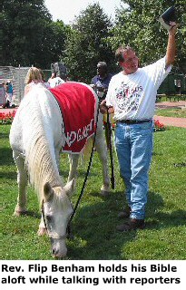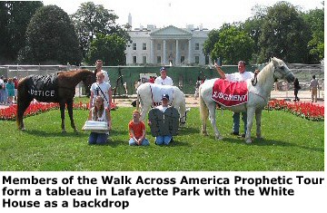 They quickly unloaded the two horses and donkey, formed a tableau in the park with the White House as a backdrop, and delivered their message over loudspeakers. It was the same message that they had been giving since they began their Walk Across America Prophetic Tour March 2 in San Clemente, Calif.: America has broken all of God’s laws, and as a result, we are suffering God’s judgment. But the Lord will be merciful if we repent. “We have walked the entire length of America with a warning from Almighty God,” said the Rev. Rusty Thomas. “Either the legalizing of child-killing and homosexuality comes to an end, or America as we know it will come to an end. “When you see great calamities come upon America, know this for certain – that these things have come upon us because of the shedding of innocent blood, the acceptance of homosexuality, and the calling of good, evil and evil, good.” Reverend Benham spoke of a previous warning he had given in front of the White House on September 8, 2001, in which he predicted disaster for the nation if it did not protect “the most innocent among us.” Three days later, he said, “nineteen men with box cutters brought this nation to her knees.” For six months Benham, Thomas and their small group had walked up to 7 hours a day, covering 15 miles a day to spread their message. “This is simply obedience to God,” Thomas explained. “He called us to walk across America and deliver this message: Repent or perish.”
