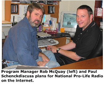 Back to the October 2006 Newsletter Index Pro-lifers launch internet radioThe pro-life movement took a giant media leap forward on September 15 with the official launching of the first-ever pro-life internet-based radio network. Clicking on either nplr.net or nationalproliferadio.net will get you pro-life news, commentary, call-in shows, music and entertainment 24 hours a day, seven days a week. Through the magic of the internet, some of the audio programming will be accompanied by video. “We’re saying that National Pro-Life Radio is the only radio you can see!” said Paul Schenck. Dr. Schenck, a pastoral associate of Priests for Life, approached Maryland attorney and pro-life activist Steve Peroutka with the idea for the radio network last summer. Peroutka, who has been doing pro-life shows on broadcast radio for years in the Washington, D.C., metroplex and recently on XM satellite radio, saw the possibilities.