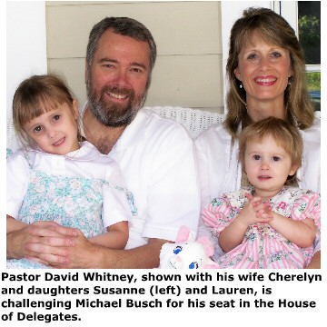 Pro-life and pro-marriage issues are foremost in Pastor Whitney’s decision to run for office. “Our rights come from God, not from government,” he explained. “The first right is the right to life; all other rights depend on that. Government’s first job is to defend the life of every citizen, including the unborn.” When governments like the State of Maryland pay for abortions, “we have an illegitimate function of government,” he asserted: “government is destroying human life.” Whitney has testified for four years in favor of an amendment to the Maryland Constitution to protect marriage, but the General Assembly has failed to act. “If Maryland’s marriage law is overturned by the courts, and I suspect it will be, we are left vulnerable; there is no regulation of same-sex marriage. That’s why the homosexual lobby has targeted Maryland,” he said. Pastor Whitney is running on the Constitutional Party ticket. “Part of the reason I left the Republican Party is because our governor fired Robert J. Smith because he said that homosexuals should not receive any special treatment from the government,” he said. Smith was fired last summer from the Metro Transit Authority Board by Governor Ehrlich, a Republican, after his remarks during a panel discussion on a cable show. “Two weeks later, Ehrlich appointed an activist homosexual as a judge in Baltimore,” said Whitney. “That, for me, was the final straw. It looks to me like he is pandering to the homosexual lobby.” Running as a third-party candidate gives him the flexibility to appeal to voters with no party affiliation, he said. “They think it’s time to get an independent candidate elected. I’m also getting good support from pro-life Republicans and Republicans concerned about the threats to marriage, as well as Democrats who are conservative on moral issues, if not on fiscal issues. “They can’t believe what Busch did to the marriage amendment when I tell them about it – they say, ‘You’re kidding!’” Pastor Whitney noted that of the three Republican District 30 candidates for House of Delegates, only two are pro-life. The third, Dr. Ron Elfenbein, has said that he doesn’t like abortion but, as a doctor, he believes abortion should be available. “By voting for me, voters are helping defeat Michael Busch and a less than 100 percent pro-life Republican for House of Delegates,” he said. Whitney, the pastor of Cornerstone Evangelical Free Church in Pasadena, has pastored churches in New Jersey, Colorado, Florida and Maryland for the past 24 years. A graduate from Rutgers University as a Henry Rutgers Honors Scholar with Honors in History, he received his Master’s Degree from Denver Seminary. For several years, Whitney has been teaching the Christian heritage and history of the United States with the Institute on the Constitution. He is editor of IOTC’s Liberty Forum Magazine and hosts a radio show on Dr. Sam Montieth’s Radio Liberty. Pastor Whitney has participated in Defend Life’s Face the Truth Tours, and was a captain in this past summer’s tour. He lives in Cape St. Claire with his wife Cherelyn and their daughters, Susanne, 5, and Lauren, 2. |